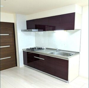 「光沢感のあるダークブラウンキッチン」。