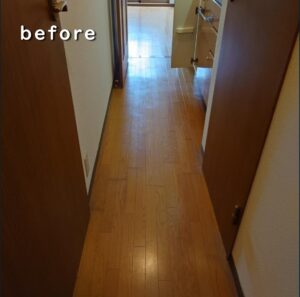 今回のお部屋は、施工前は落ち着いたブラウン系の床で温かみのある雰囲気でしたが